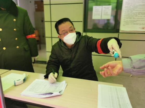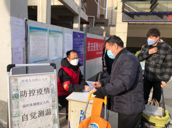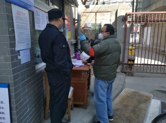 民建会员周荣、党员苏军在各自小区门口进行出入人员登记、测温等工作