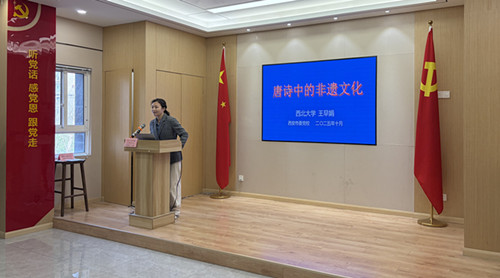 3月5日,市社科院(市社科联)机关党总支为配合3.5学雷锋日及双报到双评议活动要求,主动对接,在神舟5路社区党委开展中国优秀传统文化宣讲活动。市社科院(市社科联)学会工作处邀请西北大学王早娟副教授为社区党员宣讲《唐诗里的非遗》。