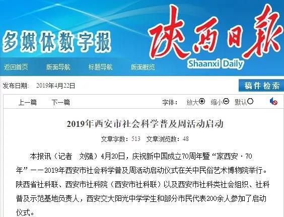4月20日,庆祝新中国成立70周年暨“家西安·70周年”——2019年西安市社会科学普及周活动启动仪式在关中民俗艺术博物馆顺利召开。陕西省社科联、西安市社科联以及西安社科类社会组织、学协会代表和广大市民代表参加了启动仪式。
