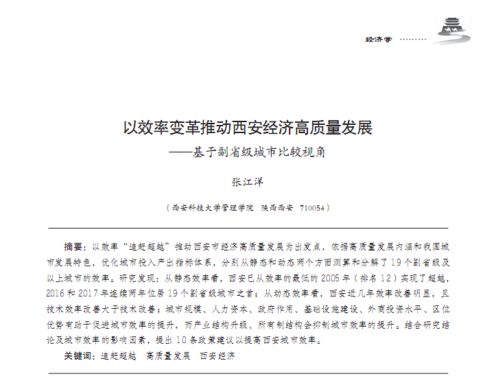以效率变革推动西安经济高质量发展---基于副省级城市比较视角